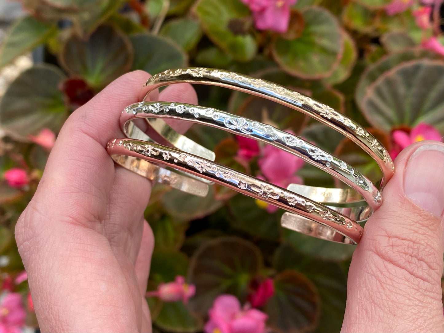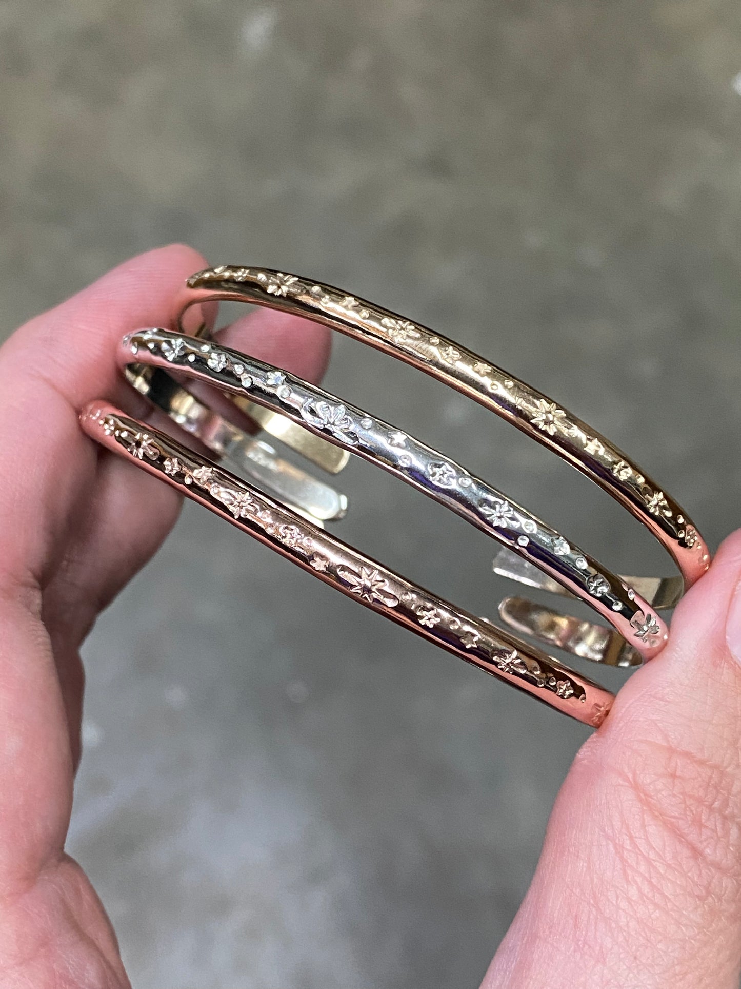 A magical, celestial cuff bracelet representing the starry night sky! Each cuff is individually stamped by hand, which makes each sky unique. These beautiful, celestial cuff bracelets look great worn alone or stacked with multiples! With three metals to choose from, you can mix and match to make your own stackable set. You can choose to have the cuff left plain, or oxidized so that the starry pattern stands out. Both finishes will have a shiny polish.