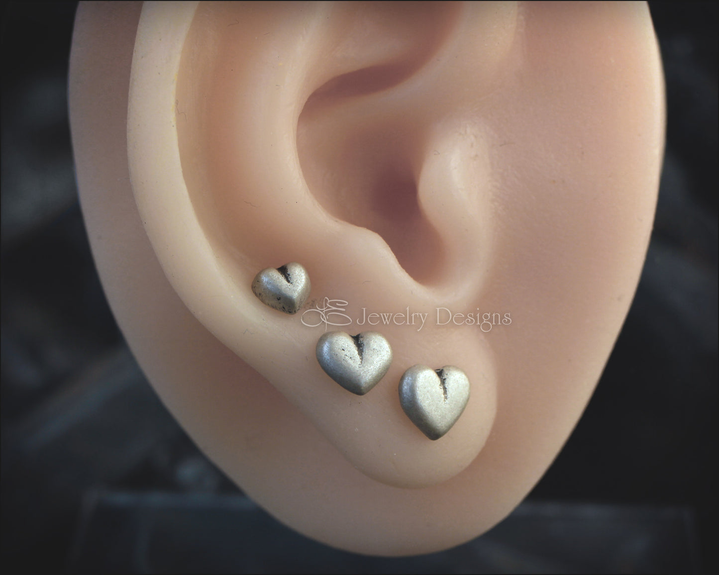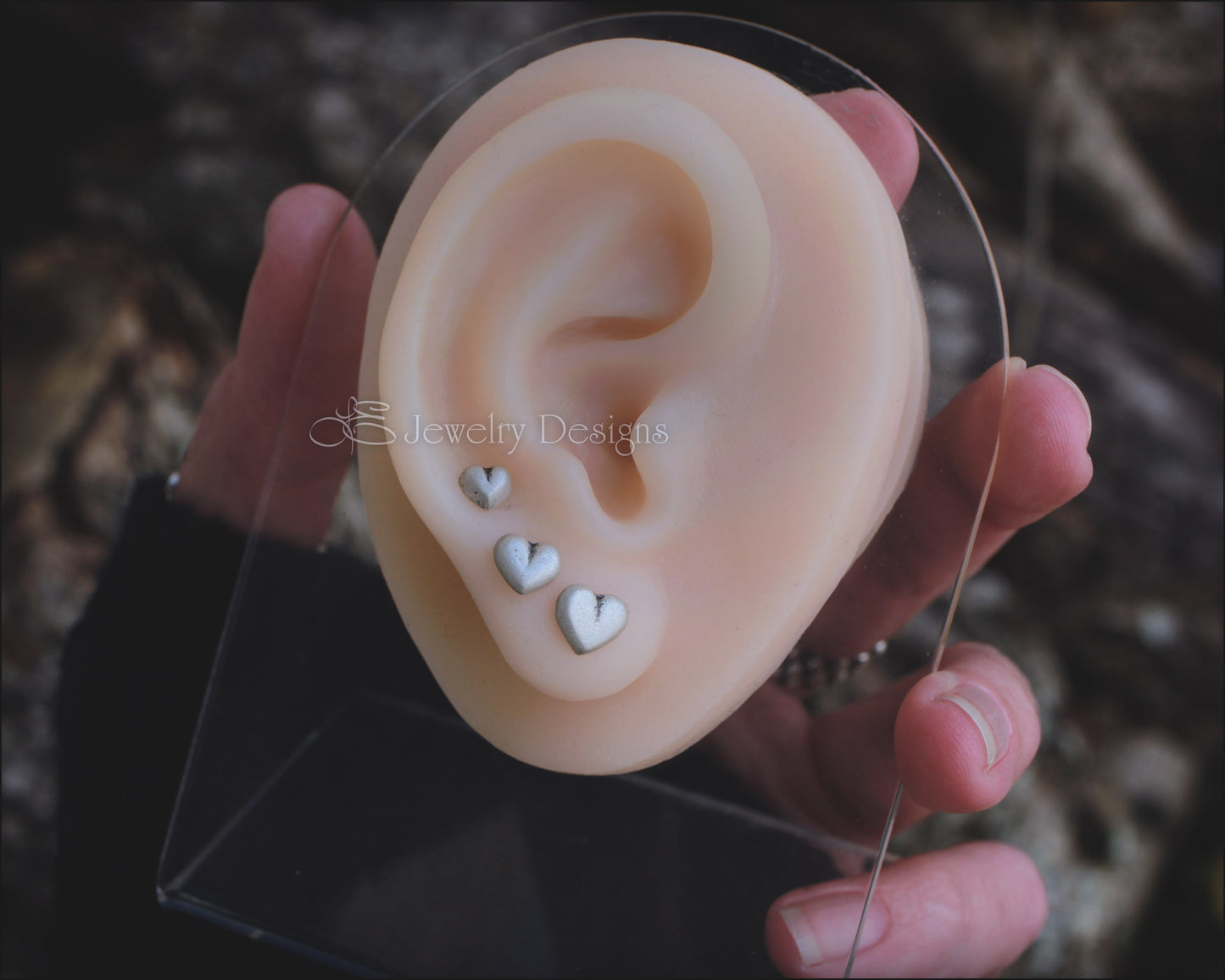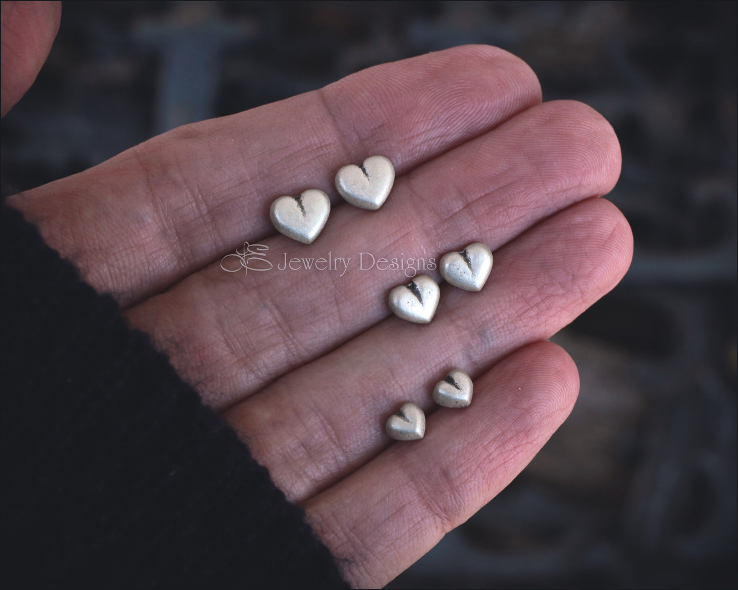 Adorable, heart studs, in three different sizes. Each heart is made by recycling silver, then pressing solid, into a steel die. They are beautifully organic, with a soft, satin finish.