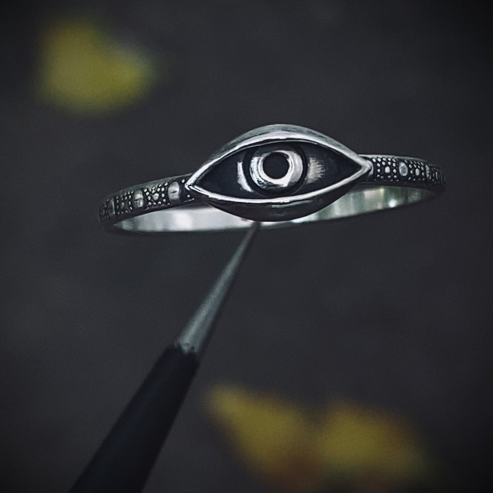 A small sterling silver evil eye rests on a band with a distinctive dotted pattern. Handcrafted from sterling silver to your size, the piece is then oxidized to highlight its intricate details, adding depth and character to the design.